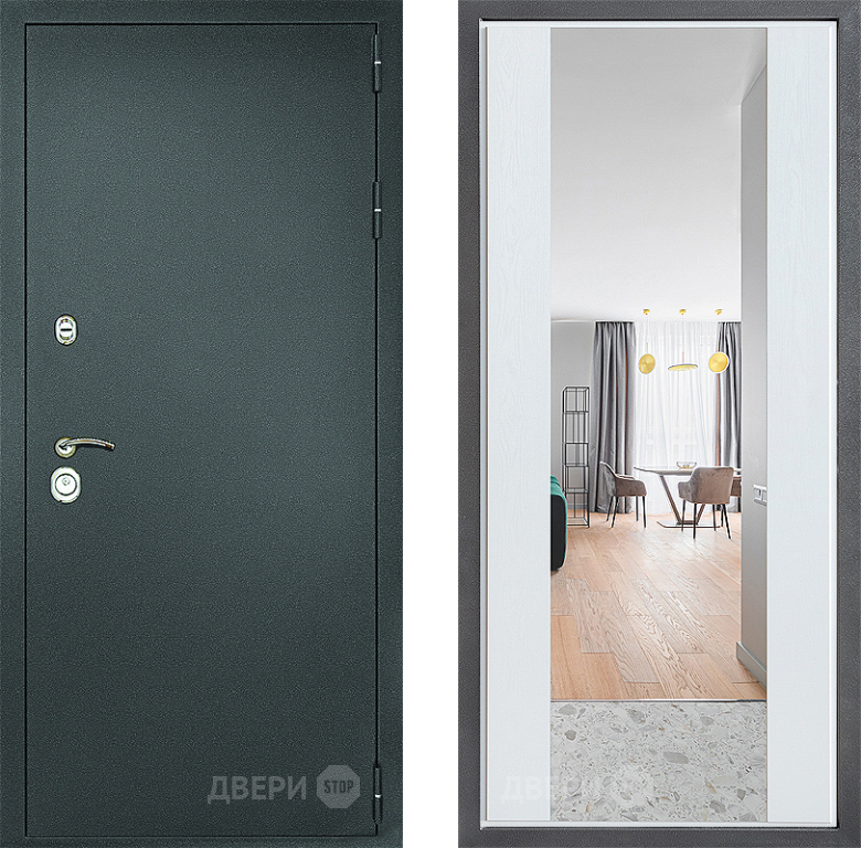 Входная Дверь Дверной континент Рубикон Серебро Дизайн ФЛЗ-1 Зеркало Белое дерево 860x2050 мм